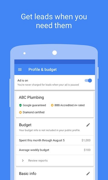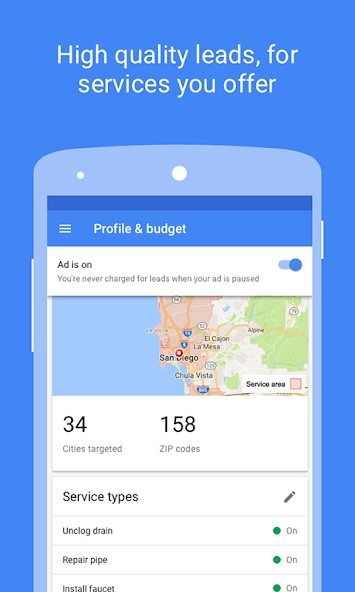 You can easily connect with potential customers looking for house cleaners, plumbers, electricians, and other nearby professionals they can trust. Get seen right at the top of Google, and get high quality leads from consumers that are looking for services like yours. All Local Services providers are vetted by Google so you can quickly build trust with customers who need your services. Most leads are phone-based so can you connect with customers on-the-go. Local Services helps you build and grow your online reputation with a personalized profile, customer reviews, and easy-to-use tools.Ads are easy to set up and you pay per lead, instead of per click, so you only pay for leads related to your business and the services you offer.