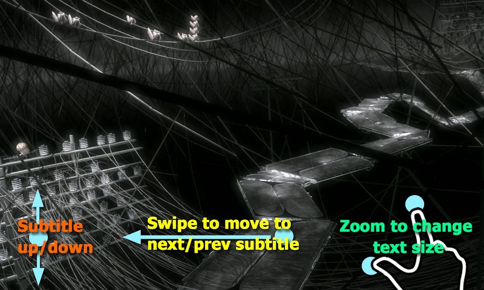 d) SUBTITLE GESTURES - Scroll forward/backward to move to next/previous text, Up/down to move text up and down, Zoom in/out to change text size.