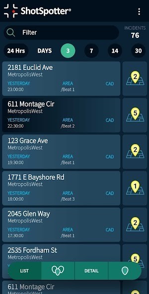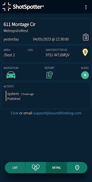 ShotSpotter gunshot alerts are delivered in real-time to your mobile device so you can respond safely and with confidence. ShotSpotter provides the nearest street address to self-dispatch when the situation warrants, gunshot audio to gain situational awareness, and precise location of the gunshot to search for evidence.Features: